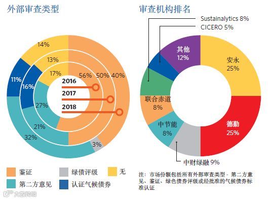 在债券认证方面,86%的债券至少获得一个外部审查,第二方意见(Second Party Opinion)的使用正在迅速增加,权威的第二方意见鉴定机构有CICERO(国际气候与环境研究中心)、Vigeo评级、DNVGL集团、CBI(气候债券委员会)、Oekom研究中心、KPMG(毕马威)、Sustainalytics和Trucost公司等。绿色债券鉴证(会计师事务所出具)虽然占比最高,但其比例在2018年下降至40%,这是因为更多的绿色债券寻求了第二方意见。