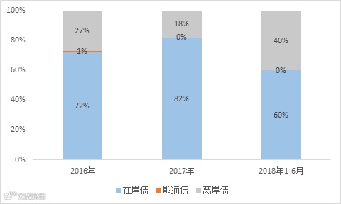 根据CBI《中国绿色债券市场报告》,中国内地绿色债券离岸市场发行规模占比从2017年的18%增长至2018年上半年的40%,离岸项目有所增加,具体如下: