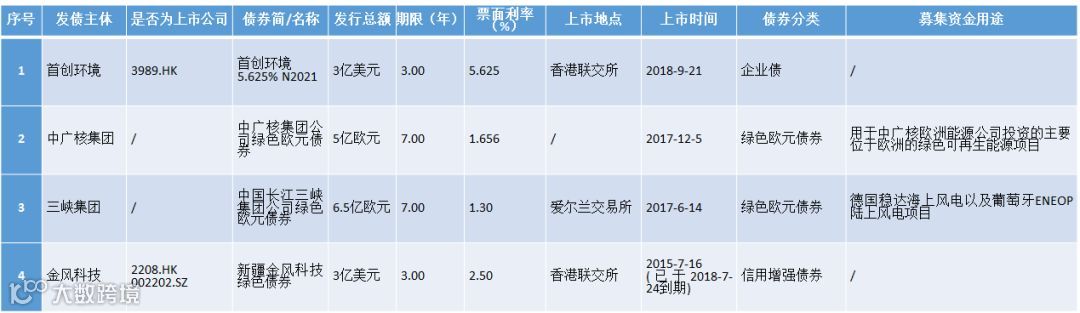 离岸绿色债券的最大发债主体仍是金融机构,公共交通企业及房地产企业境外发债规模亦位居前列。截至2019年4月25日,环保、新能源领域境内主体选择境外发行绿色债券的共4家,具体如下: