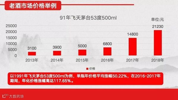 最近几年来,在“老酒越陈越香”,“存钱不如存酒”等的观念下,越来越多的人投入到老酒收藏这个行业。老酒市场逐渐从私人爱好发展成圈子爱好,并随着市场规模的不断扩大,成为了酒行业极重要的一个细分市场。在2016-2017年,老酒的市场规模涨幅高达85%,2017年的市场规模达到370亿元,2018年达到500亿元。