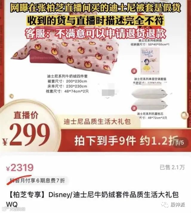 当时张柏芝在直播的时候表示,这款四件套原价高达2319元,但在自己的直播间里,通过“柏芝专享”的链接购买,只需要299元就行了,而且拍下以后,到手的会是9件东西,足足享受了1.2折的优惠,妥妥的“家人价格”。