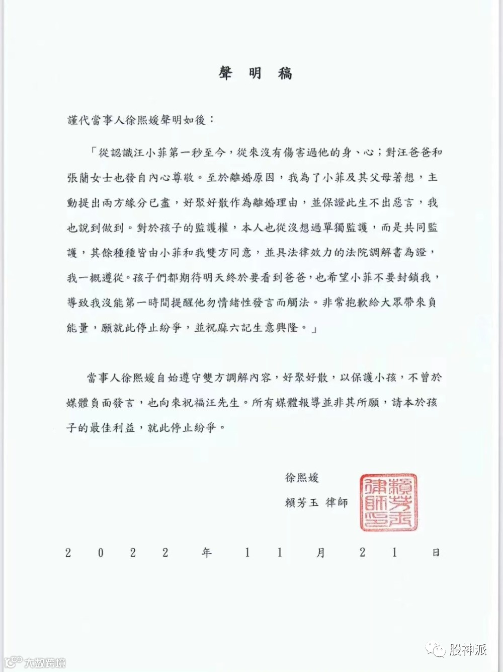 11月21日晚,大s徐熙媛通过律师发出公开声明,称离婚时曾“保证此生不出恶言”,今后也“说到做到”。大s在声明中表示:“从认识汪小菲第一秒至今,从来没有伤害过他的身、心;对汪爸爸和张兰女士也发自内心尊敬。至于离婚原因,我为了小菲及其父母着想,主动提出两方缘分已尽,好聚好散作为离婚理由,并保证此生不出恶言,我也说到做到。”