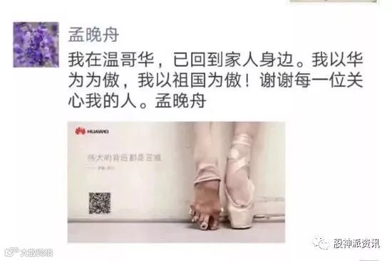 当晚,走出法庭的孟晚舟发朋友圈表示:我以华为为傲,我以祖国为傲!配图是一张“芭蕾脚”的华为广告图,上面写着:伟大的背后都是苦难。