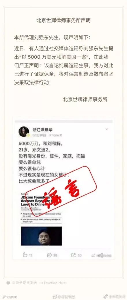 针对近日有传闻称刘强东“以5000万美元和解美国一案”,刘强东代理律所北京世辉律师事务所发布声明称:“该言论纯属造谣生事,我方对此已进行了证据保全,将对谣言制造及散布者坚决采取法律行动。”