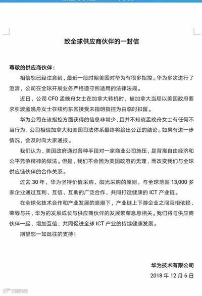 昨日晚间,华为发布致全球供应商伙伴的一封公开信,信中表示,最近一段时期美国对华为有很多指控,华为多次进行了澄清,公司在全球开展业务严格遵守所适用的法律法规。华为称,“美国政府通过各种手段对一家商业公司施压,是背离自由经济和公平竞争精神的做法。但是,我们不会因为美国政府的无理,而改变我们与全球供应链伙伴的合作关系。”