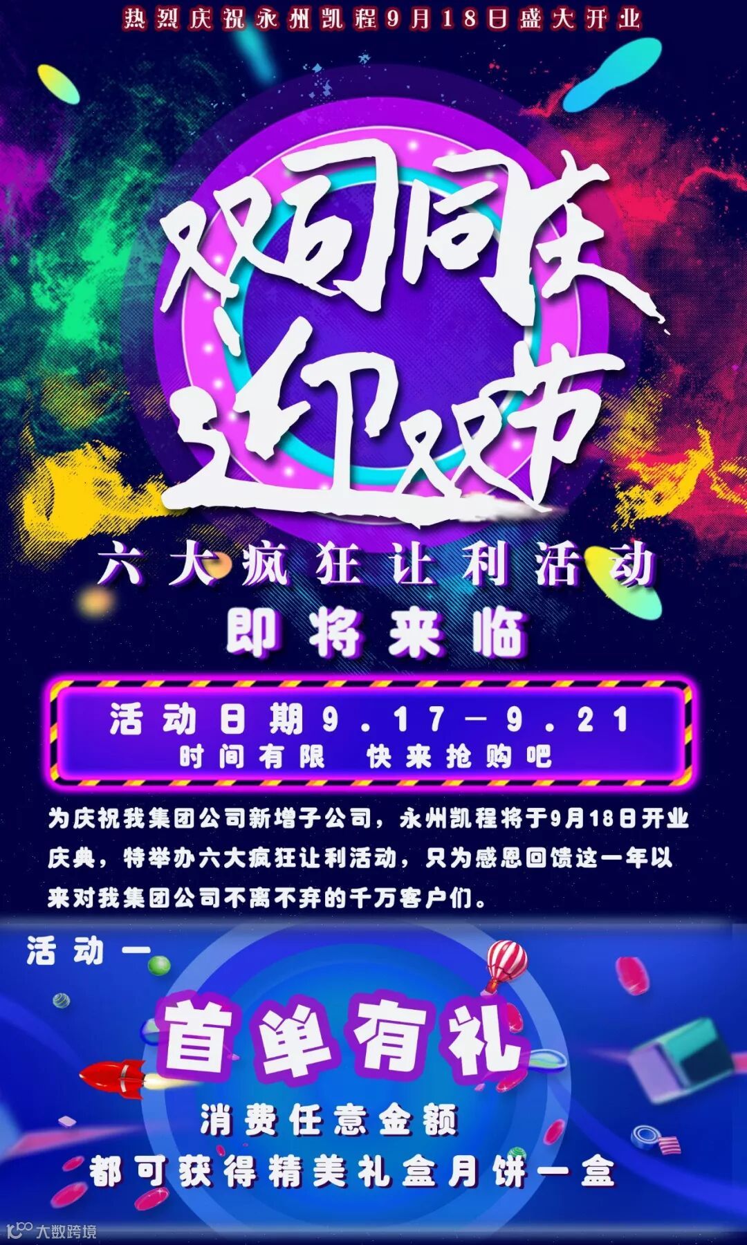 导读:为庆祝我集团公司新增子公司,永州凯程将于9月18日开业庆典,特举办六大疯狂让利活动,只为感恩回馈这一年以来对我集团公司不离不弃的千万客户们。