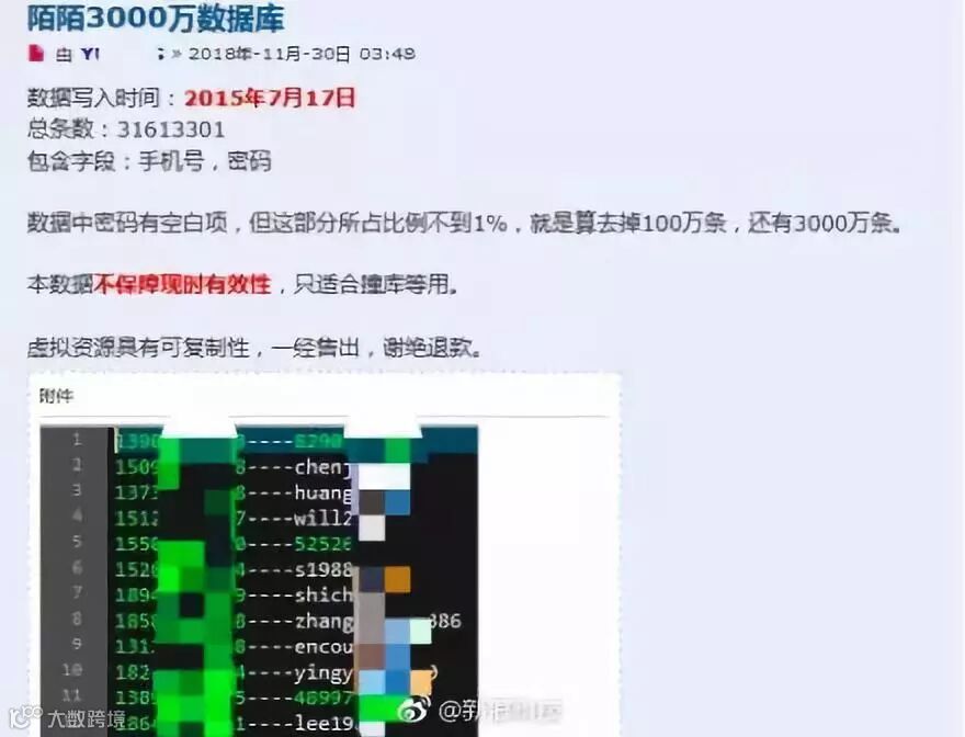 近日,网上有消息称,陌陌3000万数据在暗网上以50美金的价格出售。卖家11月30日贴出的交易截图显示,这些数据包括用户的手机号、密码,写入时间是2015年7月17日。截至12月3日中午,数据交易状态处于出售中,目前已有三人购买。卖家透露,这是三年前撞库而来的。通过尝试联系其中一些陌陌用户,有人表示网传的手机和密码信息不假。注意修改你的密码!