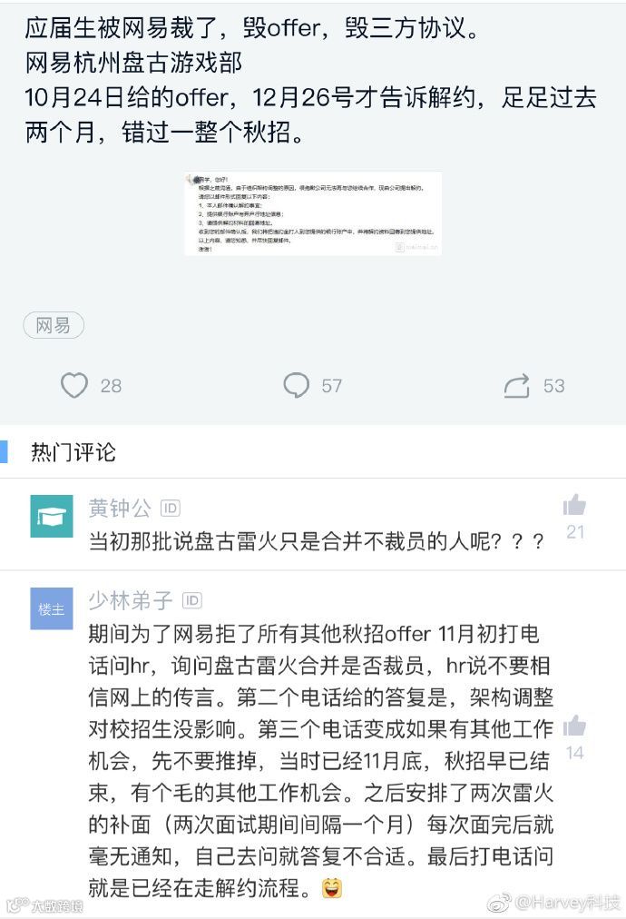 网易游戏被爆出解约2019届应届生。10月24日给的offer,12月26日通知解约,毁offer,毁三方协议。