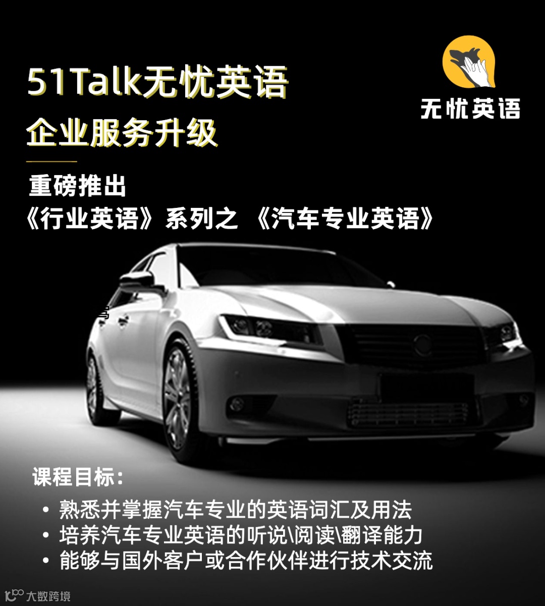 如今,中国车企海外出口量正在大幅提升。中汽协数据显示,1至9月,我国汽车整车出口211.7万辆,同比增长55.5%。随着新能源汽车赛道势头强劲,各大企业都在积极开拓海外市场,员工英语培训的需求越来越多,为此,在今年10月,51Talk无忧英语上线《汽车专业英语》课程。该课程经51Talk无忧英语资深学术团队研发,注重将汽车专业技能和语言技能相结合,重点提高学员的汽车专业英语能力,尤其是在听说、阅读及翻译方面的能力。同时,课程在行业实践的基础上将语言与实际应用相结合,为学员灵活运用知识技能创造条件。在研发新课程的基础上,51Talk无忧英语同时从外教老师、平台服务、产品功能等方面进行系统性升级,更好满足企业用户的职场学习需求。