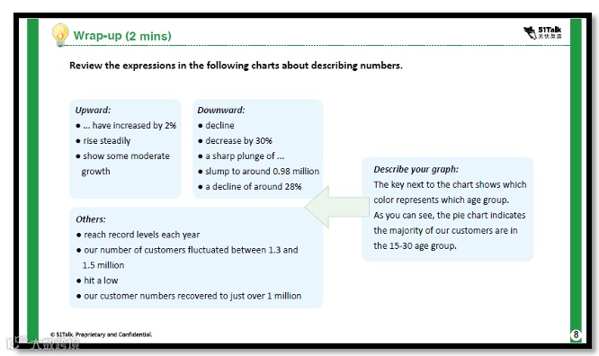2、语言基础:常用词汇搭配、图表阐述、因果关系阐述等商业演讲必备表达