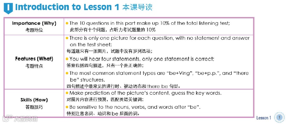 听力和阅读共分五个部分,每个部分都包含:本课导读、考核重点、解题技巧、巩固练习和总结提炼;