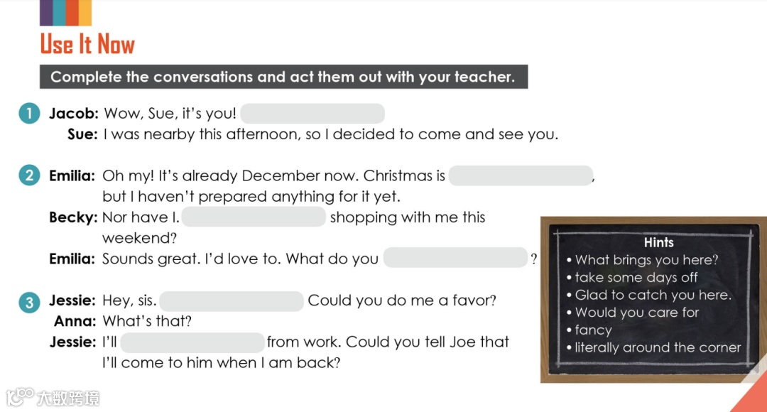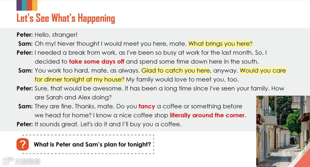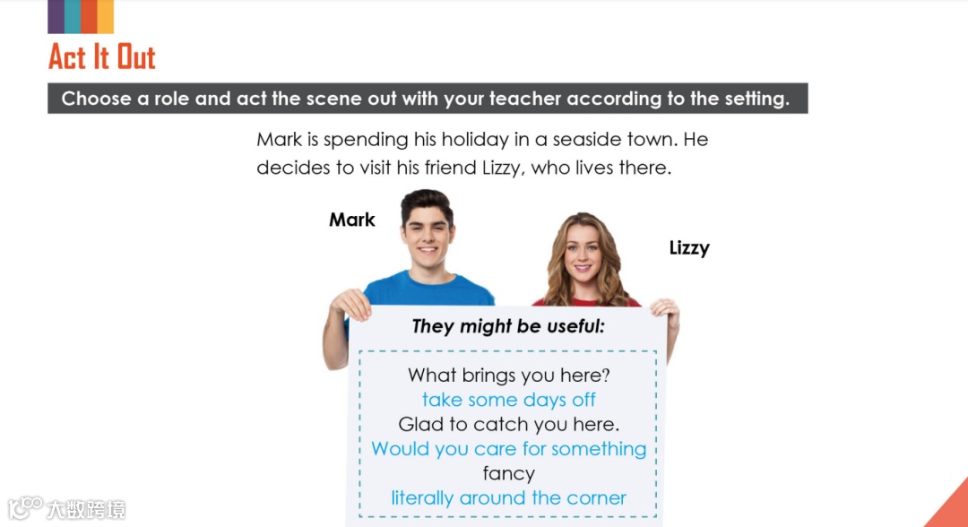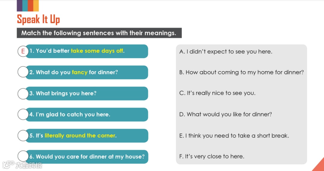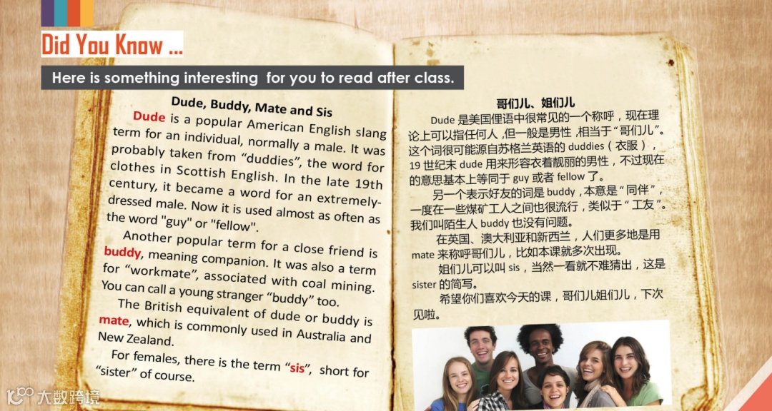 围绕国外日常生活中的真实场景展开,与老师进行真实场景演练。生动自然的对话语言,活泼有趣的口语互动,在交际语境中学习和培养语言的应用能力。