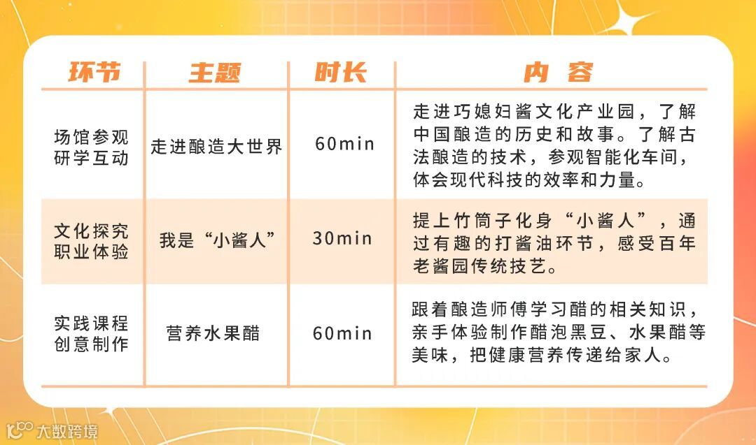 披挂上阵,变身食品鉴别“专家”,学习鉴别酱油、醋品质的优劣,了解酿造品的营养和功效,亲自上手体验打酱油,跟着酿造师傅学习醋的相关知识,制作美味营养的水果醋带回家。培养学生的动手能力,做好匠人之心的薪火传承。