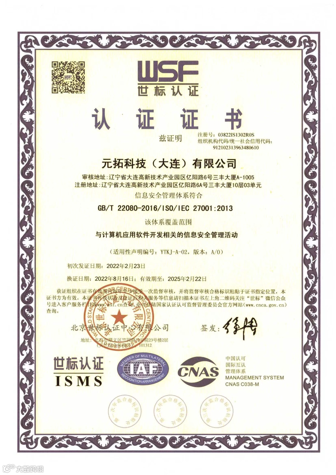 ISO27001认证证书