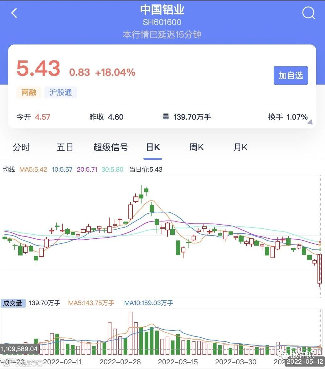 中国铝业(601600)是是全球最大的氧化铝、电解铝、精细氧化铝、高纯铝和铝用阳极生产供应商。股票分别在香港联合交易所(2600)、纽约证券交易所(ACH)和上海证券交易所(601600)三地挂牌上市。其中A股被美国明晟纳入中国A股在岸指数,H股被香港恒生纳入中国企业指数。