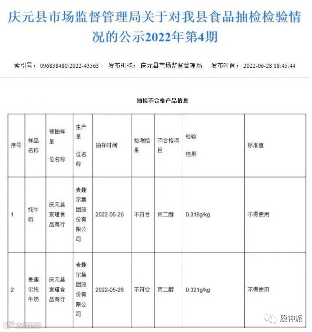 近日,浙江省庆元县市场监管局公示的2022年第4期食品抽检检验情况中称,麦趣尔集团股份有限公司生产的2批次纯牛奶不合格,不合格项目为丙二醇。