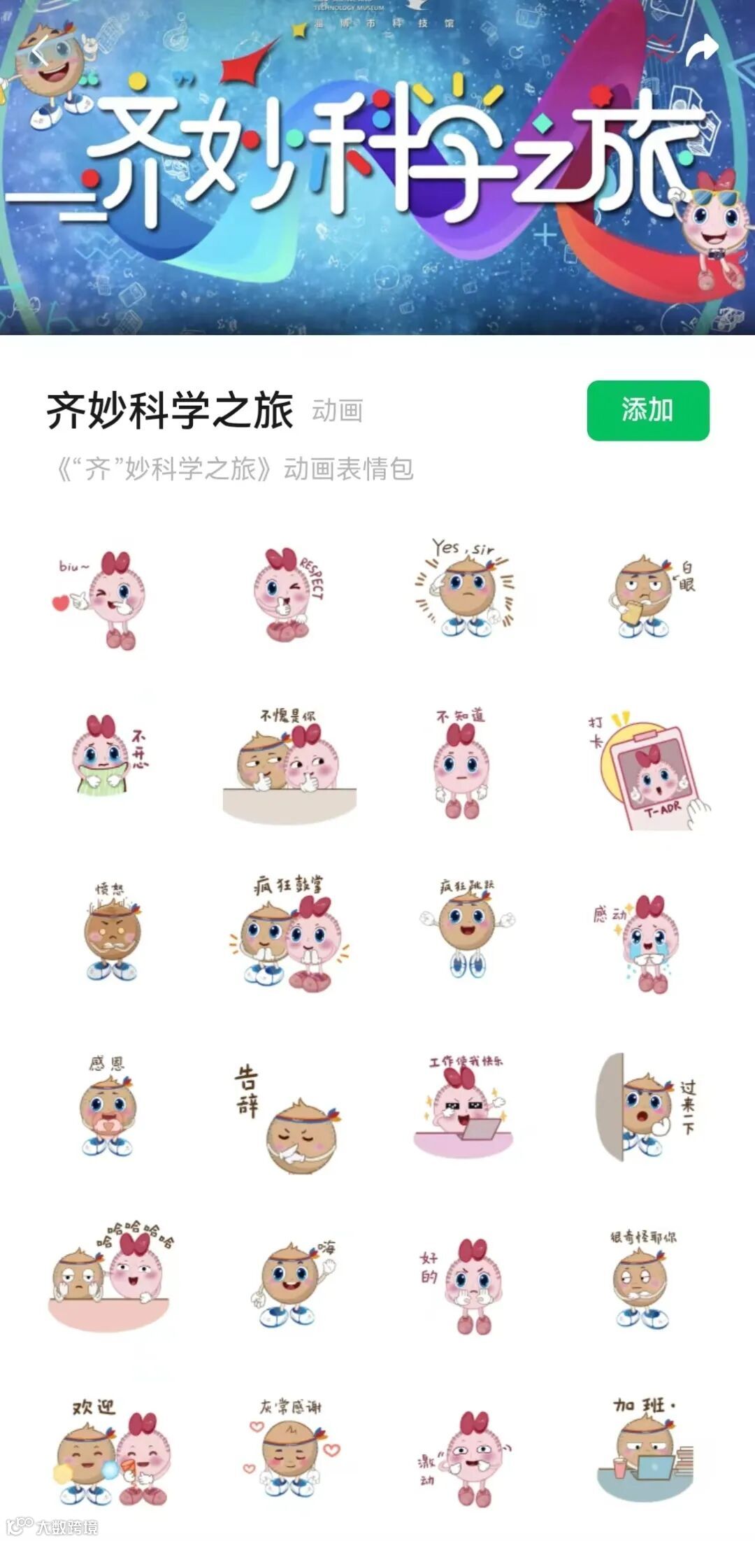 点击【添加】后即领取成功,即可免费获取淄博市科技馆文创微信表情包啦,大家快来抢啊,快快用起来吧!