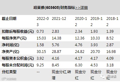 珀莱雅2021年业绩公告显示,全年营业收入达46.33亿元,同比增长23.47%;归属于上市公司股东的净利润5.76亿元,同比增长21.03%。珀莱雅2021年年度利润分配及转增股本方案为:A股每股现金红利0.86元,每股转增股份0.4股。股权登记日为2022年5月27日,除权(息)日为2022年5月30日。新增无限售条件流通股份上市日为2022年5月31日。