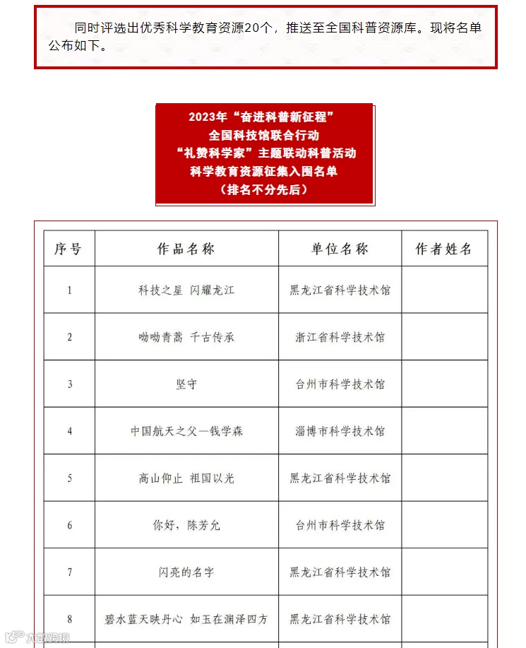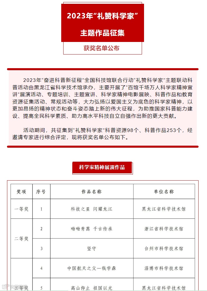 2023年“奋进科普新征程”全国科技馆联合行动“礼赞科学家”主题联动科普活动由中国科协科学技术普及部指导,中国科学技术馆、中国自然科学博物馆学会科技馆专业委员会主办,黑龙江省科学技术馆承办。活动按作品类型设立等次奖励,分别为一等奖3名(展演作品1名及宣讲作品2名),二等奖6名(展演作品2名及宣讲作品各4名),三等奖9名(展演作品3名及宣讲作品6名),优秀奖若干名。《中国航天之父——钱学森》作为全国18个获得等次奖项的作品之一,同时被评选为本次征集活动20个优秀科学教育资源,被纳入2023年科技馆联合行动“礼赞科学家”主题活动优秀作品集,同时推送至全国科普资源库,进行全国性公益科普传播。