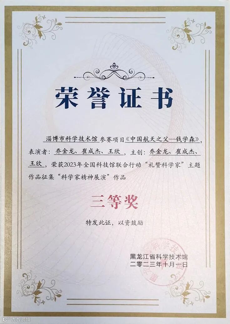 近日,2023年“奋进科普新征程”全国科技馆联合行动“礼赞科学家”主题作品征集活动获奖名单公示,淄博市科技馆选送的由乔金龙、崔成杰、王欣主创表演的《中国航天之父——钱学森》作品在全国范围内征集的350余件作品中脱颖而出,斩获全国三等奖。