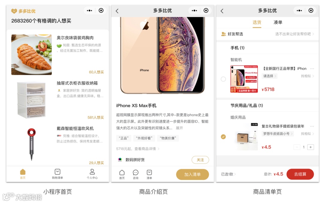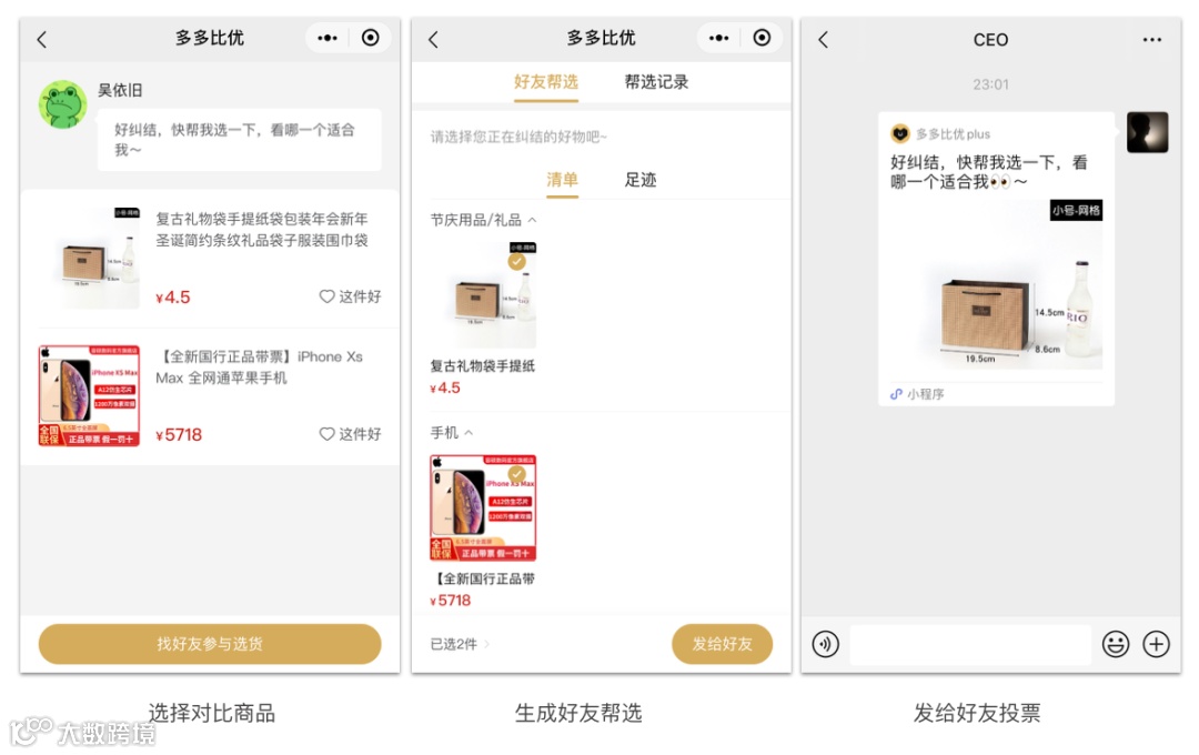 此外,多多比优小程序在裂变上也很不像拼多多的风格,仅支持将商品加入清单、直接购买,唯一涉及到分享传播的功能就是选货。