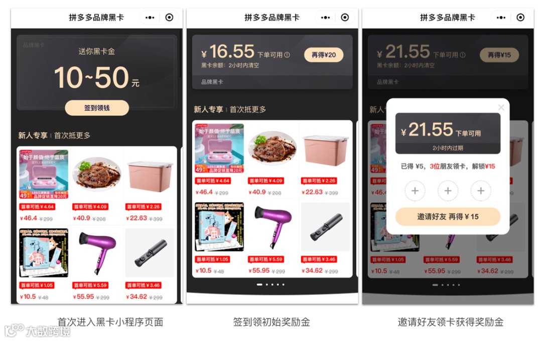 拼多多品牌黑卡小程序基于品牌商品,借助黑卡概念发放优惠,进行裂变。