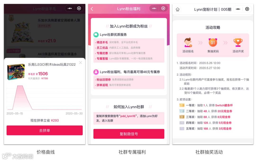 Lynn运营方式比较丰富,除了邀请好友获取羊毛券,还积极引导用户添加微信、加入社群;并且有社群专属的抽奖活动,同样是裂变传播。