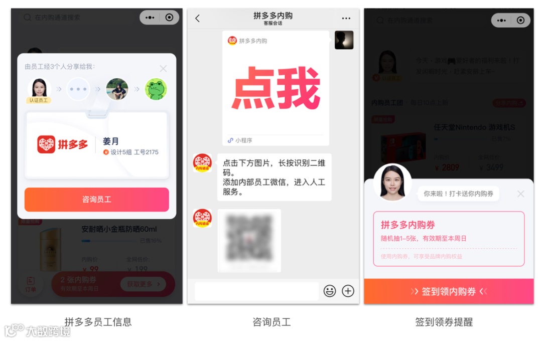 拼多多内购小程序的有趣在于努力包装真实的拼多多员工,真实的头像、真实的姓名、真实的部门、真实的工号,真实的分享路径,真实的咨询员工。