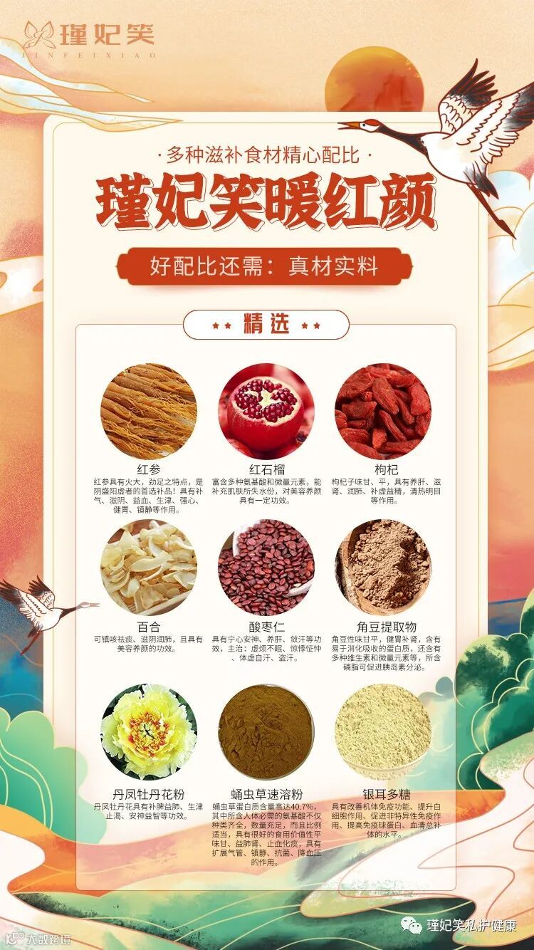 瑾妃笑暖红颜红参红石榴固体饮料:以“药食同源”为核心理念,以“君臣佐使”为组方原则。优化组合 5 款药食同源类食品原料 (红枣粉,枸杞粉,百合粉,酸枣仁粉,生姜粉) 为“君”位原料,辅以“臣”位食品原料 (红参粉,红石榴果汁粉,丹凤牡丹花粉, γ- 氨基丁酸) ,添加其他功效原料 (角豆粉,蛹虫草速溶粉,银耳多糖,透明质酸 钠,血蛋白多肽粉,阿胶肽,N-乙酰神经氨酸) 。可连续、长期有效食用,安全可靠,功效精准,是为需要补气血亚健康人群精心打造的功能性健康产品。
