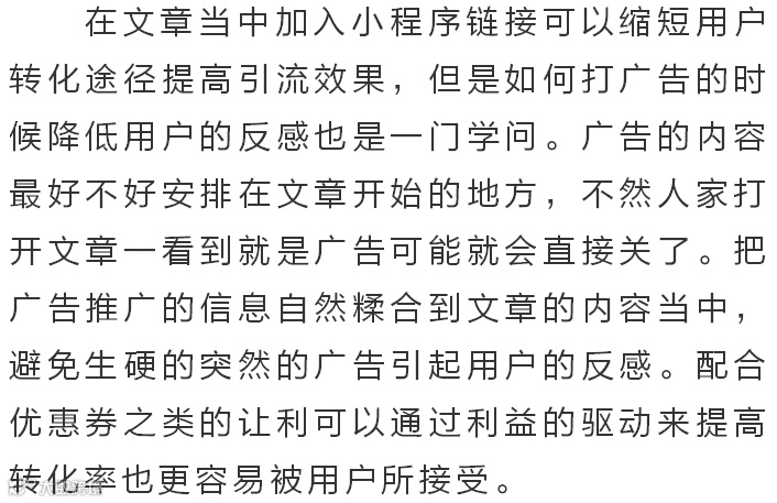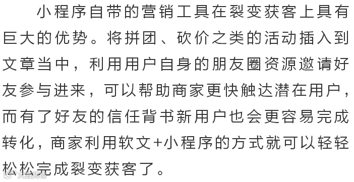 具有社交优势的小程序在获客引流上面具有很大的优势,但是也因为其去中心化的特点很多商家会觉得一筹莫展,小程序的价值如何才能得到充分的释放?利用软文进行营销是个不错的方式。公众号+小程序的组合拳可以帮助商家提高获客效率。