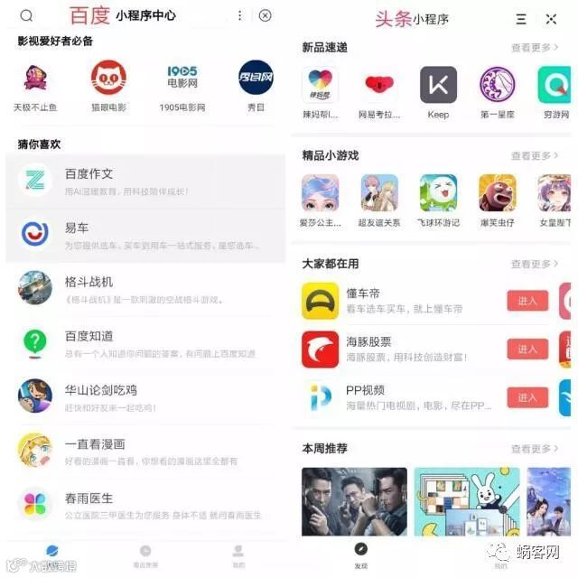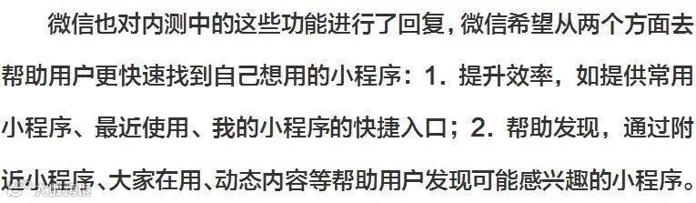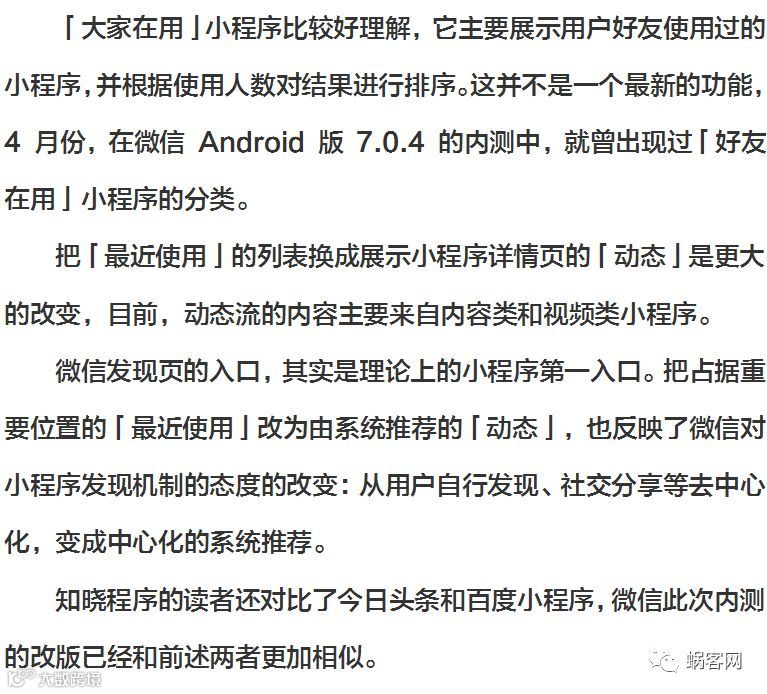 8 月 6 日,据新榜报道,微信正在内测一项新的改动,微信「发现」页的「小程序」界面有比较大的变化:目前的正式版中,改界面有「附近的小程序」、「我的小程序」和「最近使用」。