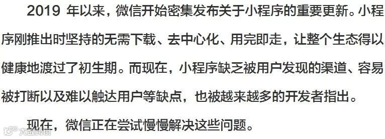 2019 年,小程序正沿着这样的规划改变,其中的一些改变被认为充满想象力,也有很多改变并没有被有效认知,可以预见,这样的改变还会继续下去。不管是对开发者还是微信来说,都面临很多新的命题。