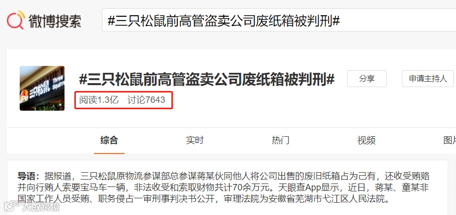 最近,零食第一股三只松鼠登上微博热搜,不为产品,而是因前高管盗卖公司废纸箱被判刑。