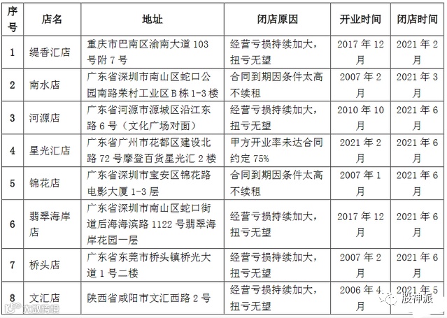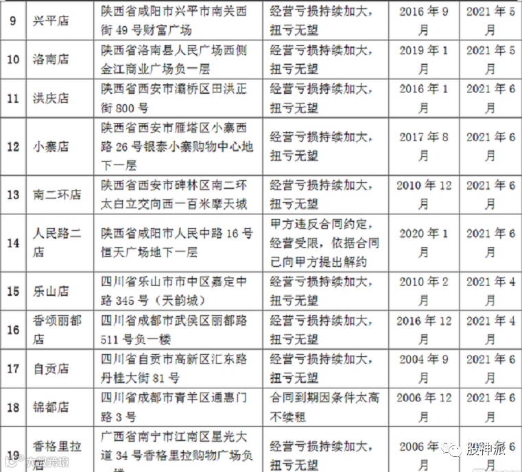 在这些门店中,有营业超过16年的老店铺,也有店面仅仅营业了4个月就被关闭。这19家门店的具体情况如下:
