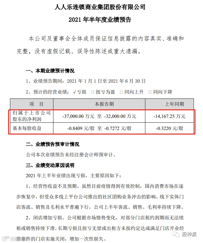 虽然目前疫情得到有效控制,国内消费市场在逐步恢复中,但受众多线上平台公司推出的社区团购业务冲击的影响,线下实体门店客流、销售及毛利水平普遍下行,公司上半年客流、销售、毛利率持续下降,导致上半年公司经营性收益不及预期。