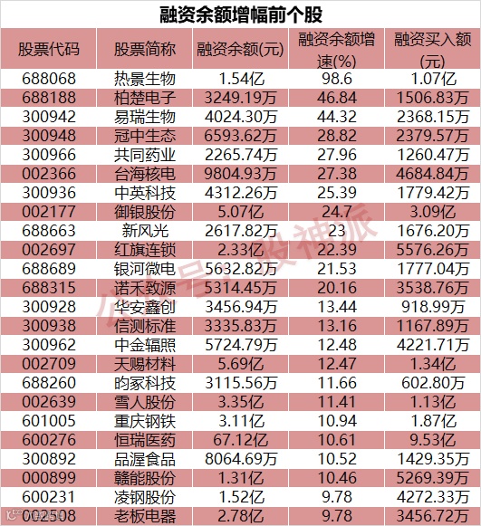 融资余额增幅居前的还有冠中生态、共同药业、台海核电等。