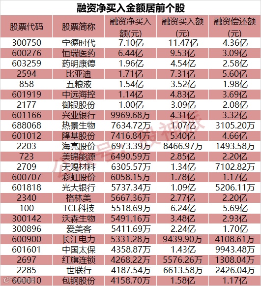 从融资净买额来看,获融资净买入的股票有982只股,净买入金额在千万元以上的有165只,其中7只融资净买入额超1亿元。宁德时代融资净买入额居首,当日净买入7.1亿元,其次是恒瑞医药、药明康德,融资净买入金额分别为6.44亿元、1.96亿元。