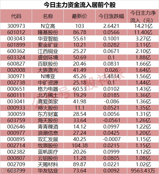 主力资金流入居前个股