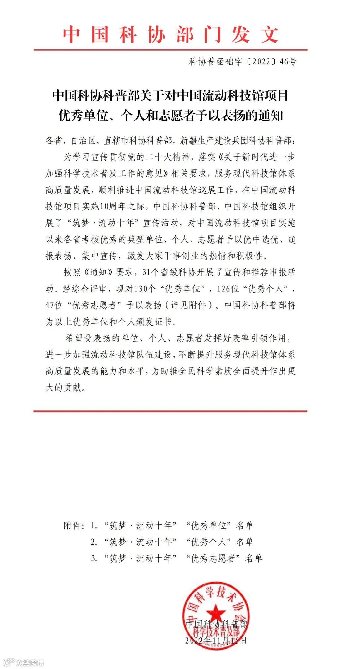 为学习宣传贯彻党的二十大精神,落实《关于新时代进一步加强科学技术普及工作的意见》相关要求,服务现代科技馆体系高质量发展,顺利推进中国流动科技馆巡展工作,在中国流动科技馆项目实施10周年之际,中国科协科普部、中国科技馆组织开展了“筑梦·流动十年”宣传活动,全国31个省级科协开展了宣传和推荐申报工作。近日,中国科协科普部公布了“筑梦·流动十年”活动的评选结果,对中国流动科技馆项目实施以来各省考核优秀的典型单位、个人、志愿者予以优中选优、通报表扬、集中宣传。经综合评审,评选出“优秀单位”130个,“优秀个人”126位,“优秀志愿者”47位,淄博市科技馆荣获“筑梦• 流动十年”中国流动科技馆项目“优秀单位”称号。