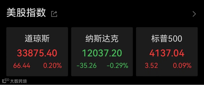 当地时间4月24日,美股三大股指涨跌不一。道指涨0.20%报33875.40点,标普500指数涨0.09%报4137.04点,纳指跌0.29%报12037.2点。