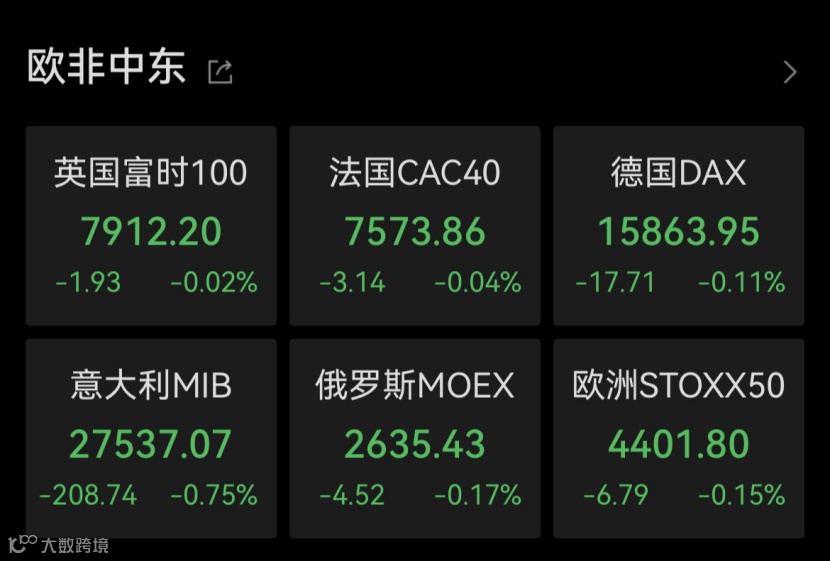 此外,4月24日,欧洲主要股指小幅收跌。德国DAX指数跌0.11%,法国CAC40指数跌0.04%,英国富时100指数跌0.02%。