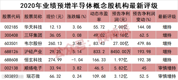 据股神派统计,2020年业绩预增个股中,华天科技获得机构给予“增持”评级,也就是说机构相对比较看好。与此同时,还有6家半导体龙头同样获得“增持”评级,包括三环集团、韦尔股份、沪硅产业、恒玄科技、顺络电子、瑞芯微等。
