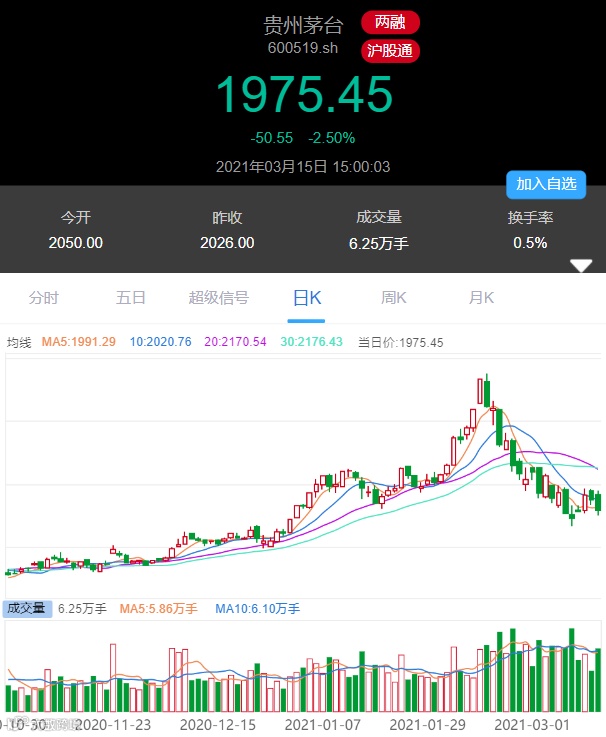 截至3月15日,贵州茅台收盘跌2.50%,报1975.45元,跌破2000点大关,总市值2.48万亿元。