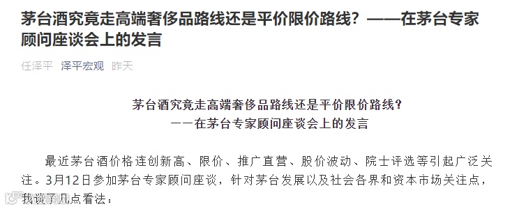 3月13日,任泽平在个人社交平台力挺茅台走高端路线,并提出,茅台酒是未来中国最有可能走向世界的奢侈品牌之一,以后在国外的售价可以考虑是国内的2倍。不仅茅台应该走高端奢侈品定位,中国应该多出几个自主品牌去抢占全球奢侈品市场。