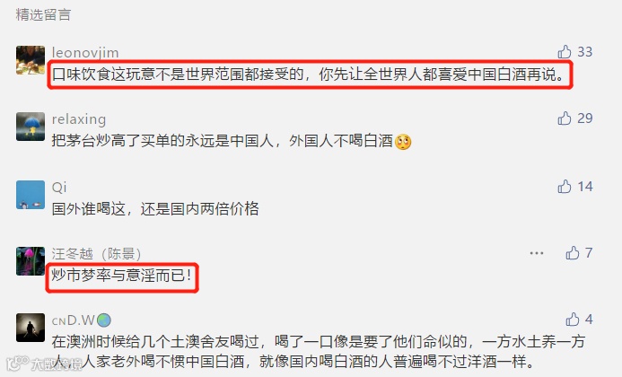 任泽平此言一出,舆论立即分化,有不少支持者表示,“茅台必须奢侈品化才有出路,凭什么一个包卖几十万,茅台就不可以,直接涨价到3万一瓶,爱喝不喝”、“说的没错,中国最好的白酒才3000一瓶,比法国高级红酒便宜太多”。
