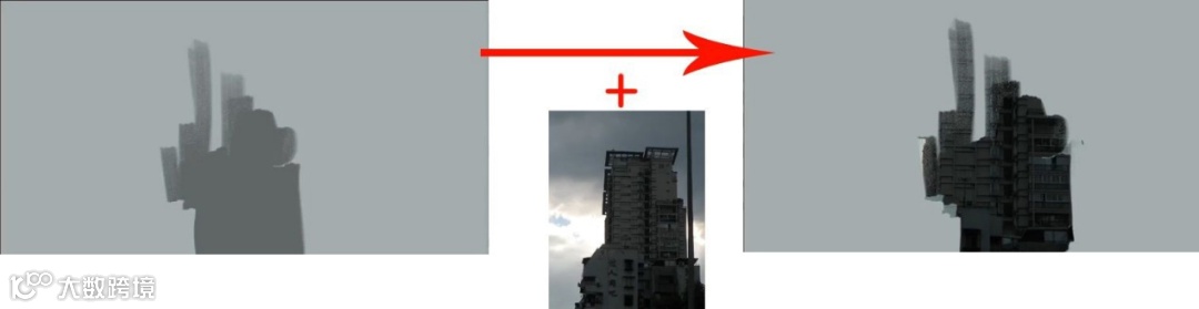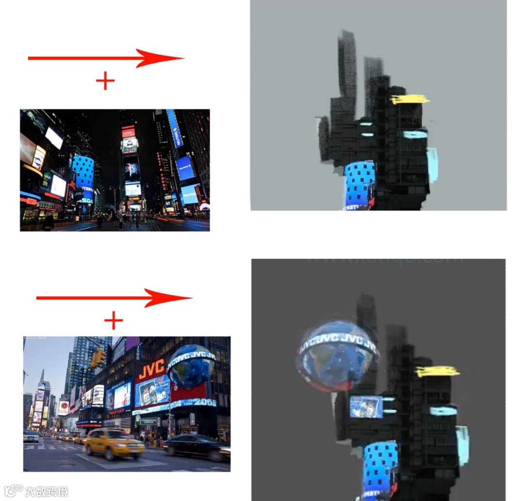 先画一个建筑的剪影;贴素材,引用纹理,使用叠加模式,修补边缘,让存在变为合理;