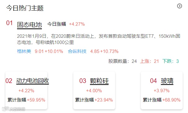 除了抱团股,今天新能源车板块表现也不错。这个板块我认为主要还是今天抱团回暖,近期碳酸锂持续涨价,但是股价却一直不动,锂电板块接着指数回暖之际,也反弹一把。