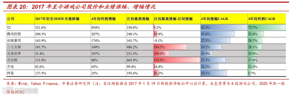 近4年间,A股游戏公司股价的波动剧烈,弹性最大。A股三七互娱、完美世界、吉比特的区间最高涨幅,分别达到486.2%、231.5%、665.9%,区间最高涨幅与区间涨幅之差分别高达384.5%、180%、534.9%,而其余5家公司中差值最大的网易也仅仅只有56.2%。
