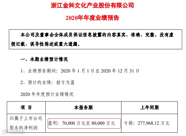 除上述利好消息之外,金科文化最近可谓是好事不断。1月7日晚间金科文化发布了2020年年度业绩预告,公司预计2020年归属于上市公司股东的净利润为7亿至8亿元,同比扭亏为盈。