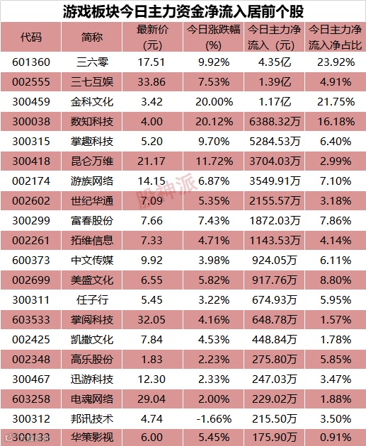 截止最新收盘,金科文化、德力股份、三六零封板,慈星股份、昆仑万维大涨超11%,掌趣科技、蓝色光标、三七互娱、富春股份等纷纷跟涨,涨超7%。